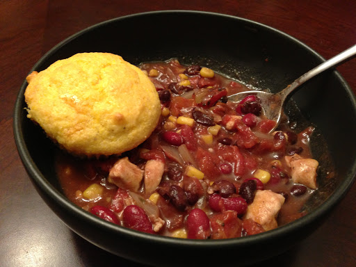 I love making pots of stuff like this when I have a brain freeze over what we are going to eat for dinner. This is a low cost, low sodium, vitamin filled, stomach filling meal that is very easy to make. If you have the time you can always use dry beans in the menu and lower the sodium even more. You can top this off with crushed tortilla chips, fresh sliced avocado, shredded cheese or sour cream. I served ours with hot corn muffins.