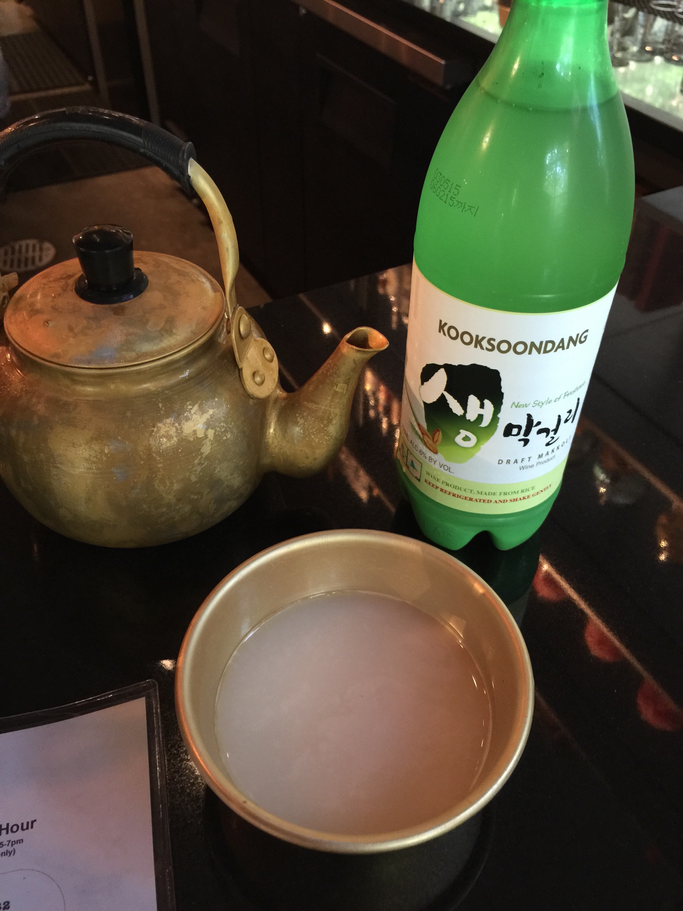 I washed it all down with this crazy, cloudy beverage that is presented in a tea pot and drunk from a bowl called Kooksoondang- Draft Makkoli. It is a wine/saki type drink that is served cold. I am adventurous in my cocktails and this adventure did not disappoint. It has the full flavor that you usually find with saki but somehow they dialed it back a notch and it was quite pleasant. Of course I had to take a photo of the bottle because it is not possible that I will be able to remember that name to find it on a menu.