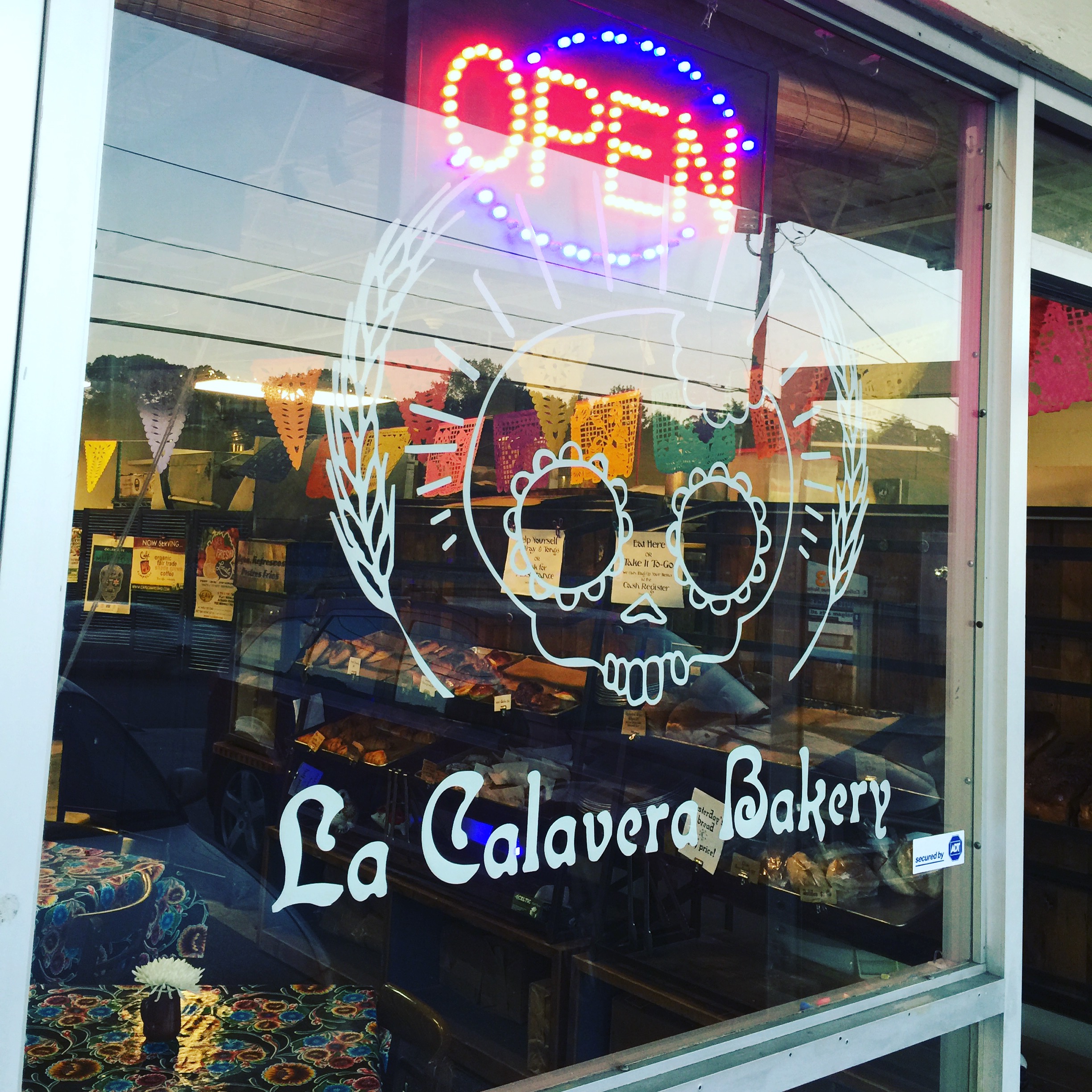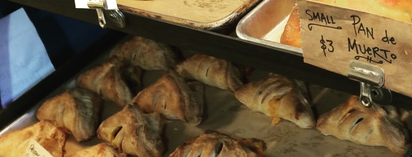 Next door to the Avondale MARTA Station on East College Avenue sits a quaint little ship called the La Calavera Bakery. The large window in the front is painted with a calavera (skull) wrapped in two sprigs of grain and crowned with a glowing OPEN sign. It kind of piques your interest. I’d driven past it numerous times before deciding to stop by one morning to see what they had inside. My pastry loving self is so happy that I did. Small and large fresh baked loaves of bread and other carb filled goodies greet you at the door. Chocolate babkas, pan de muerto,sprouted whole wheat and sourdough breads line the shelves and fill the air with enticing aromas. While the sweet smells occupy your nose; the calaveras made from sugar, ceramic and wooden that decorate the shop are a delight for the eyes.