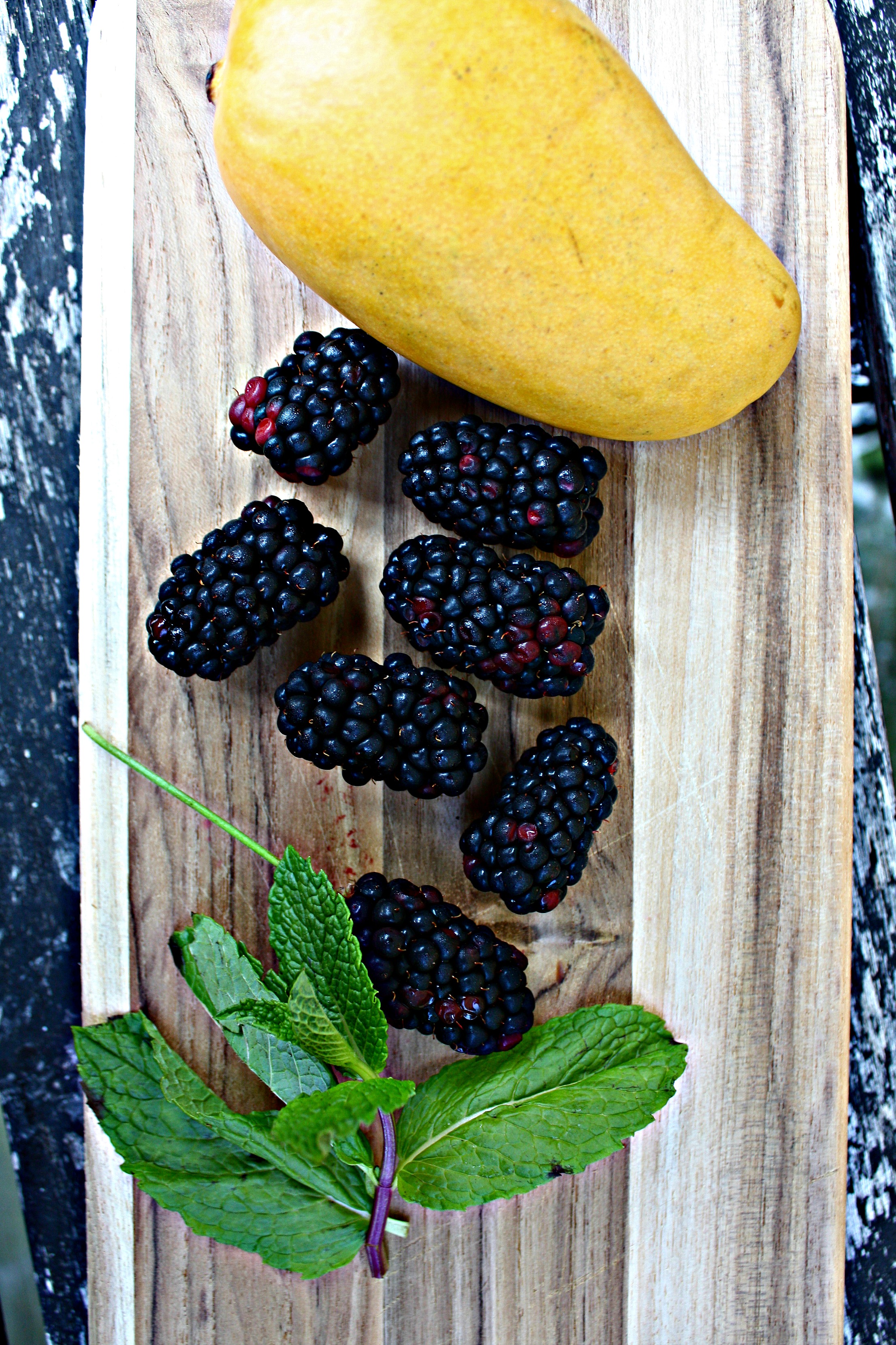 Purée 1 cup frozen mango chunks, ice cubes, 1/2 cup strained blackberries, 1/4 cup plain greek yogurt, and 1 tablespoon in a blender until smooth.